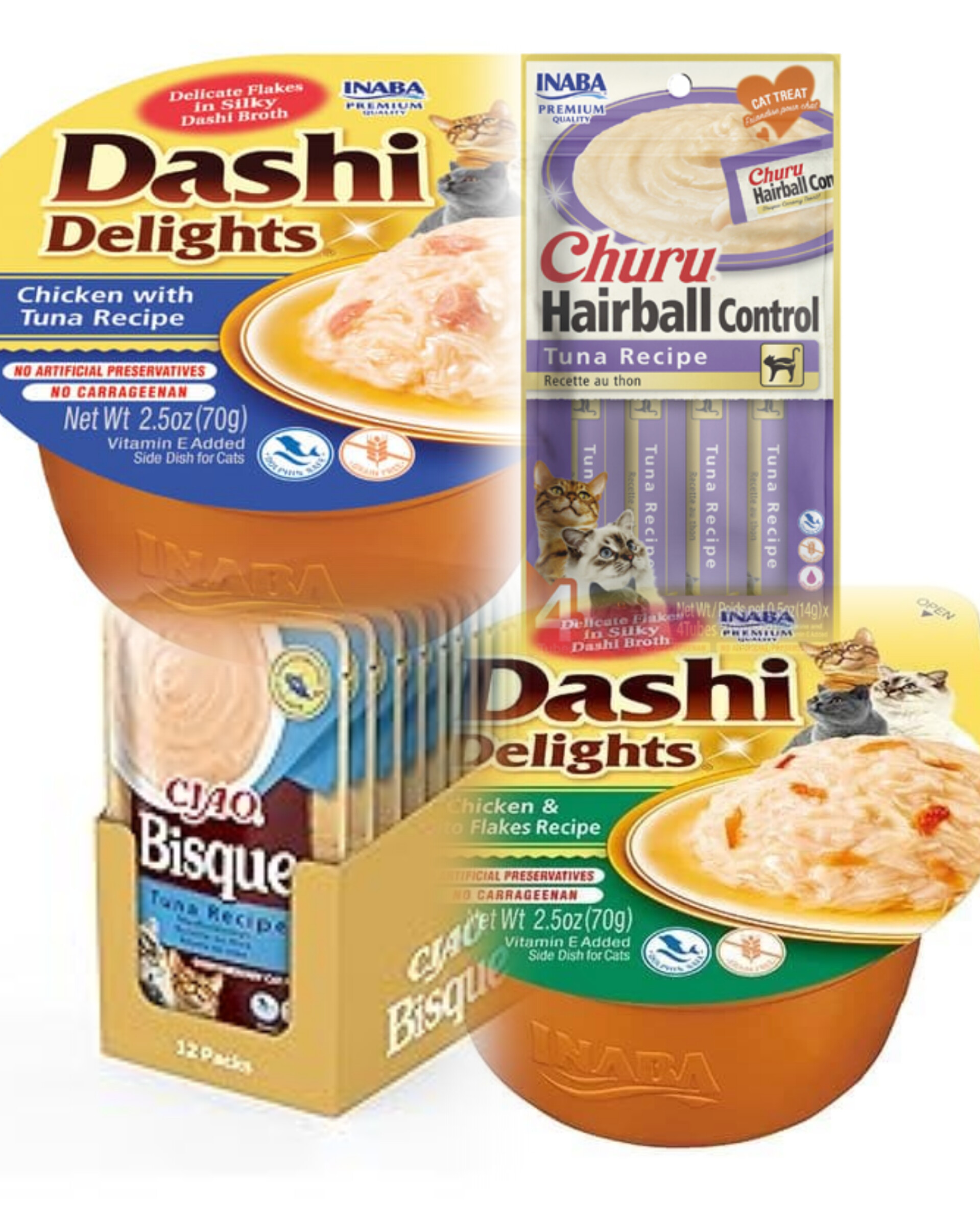 Supice INABA Dashi, kremasta pašteta Ciao Bisque i mini paštetice Churu hairball control. Sve je dostupno na sajtu i u prodavnici