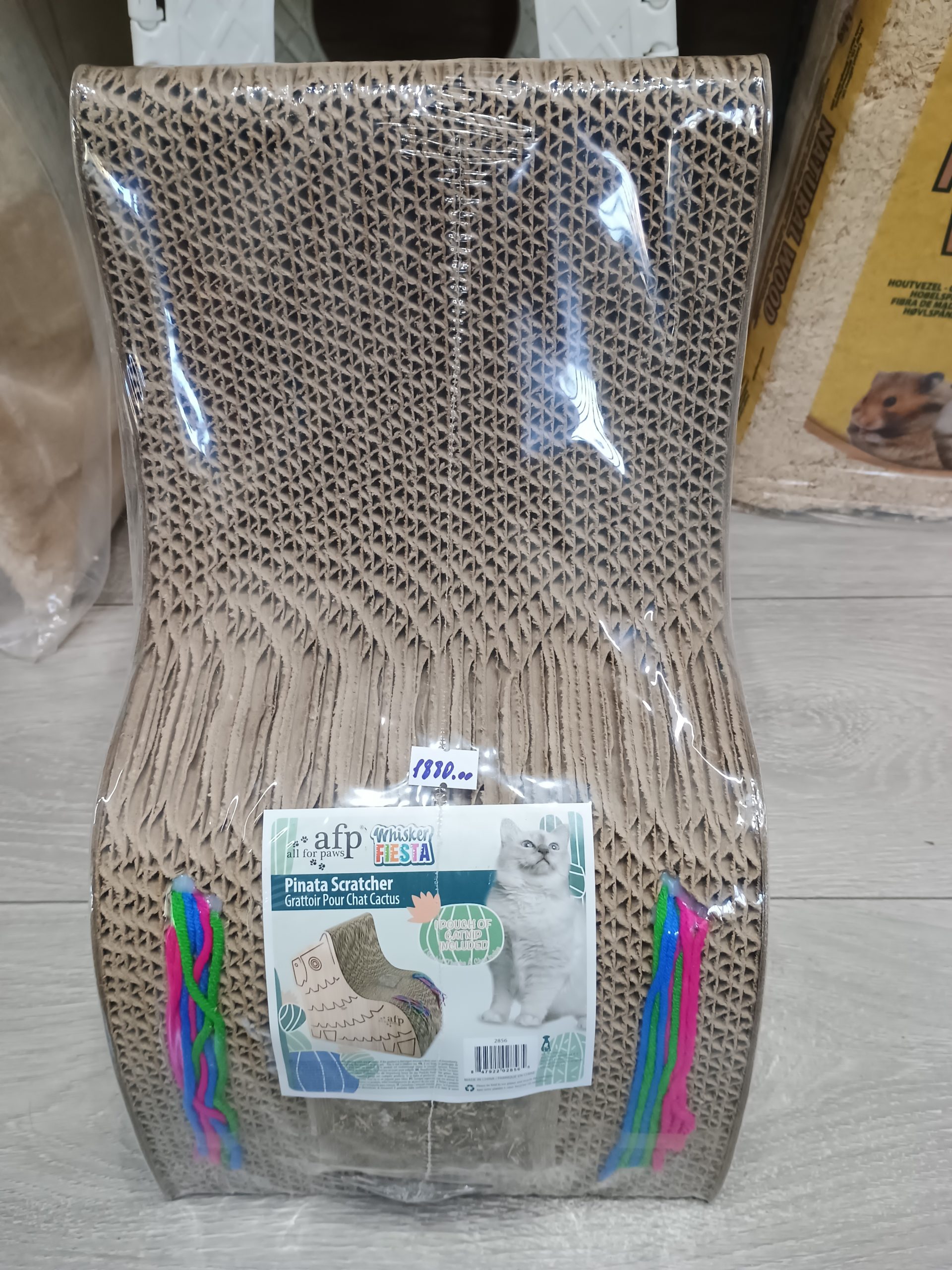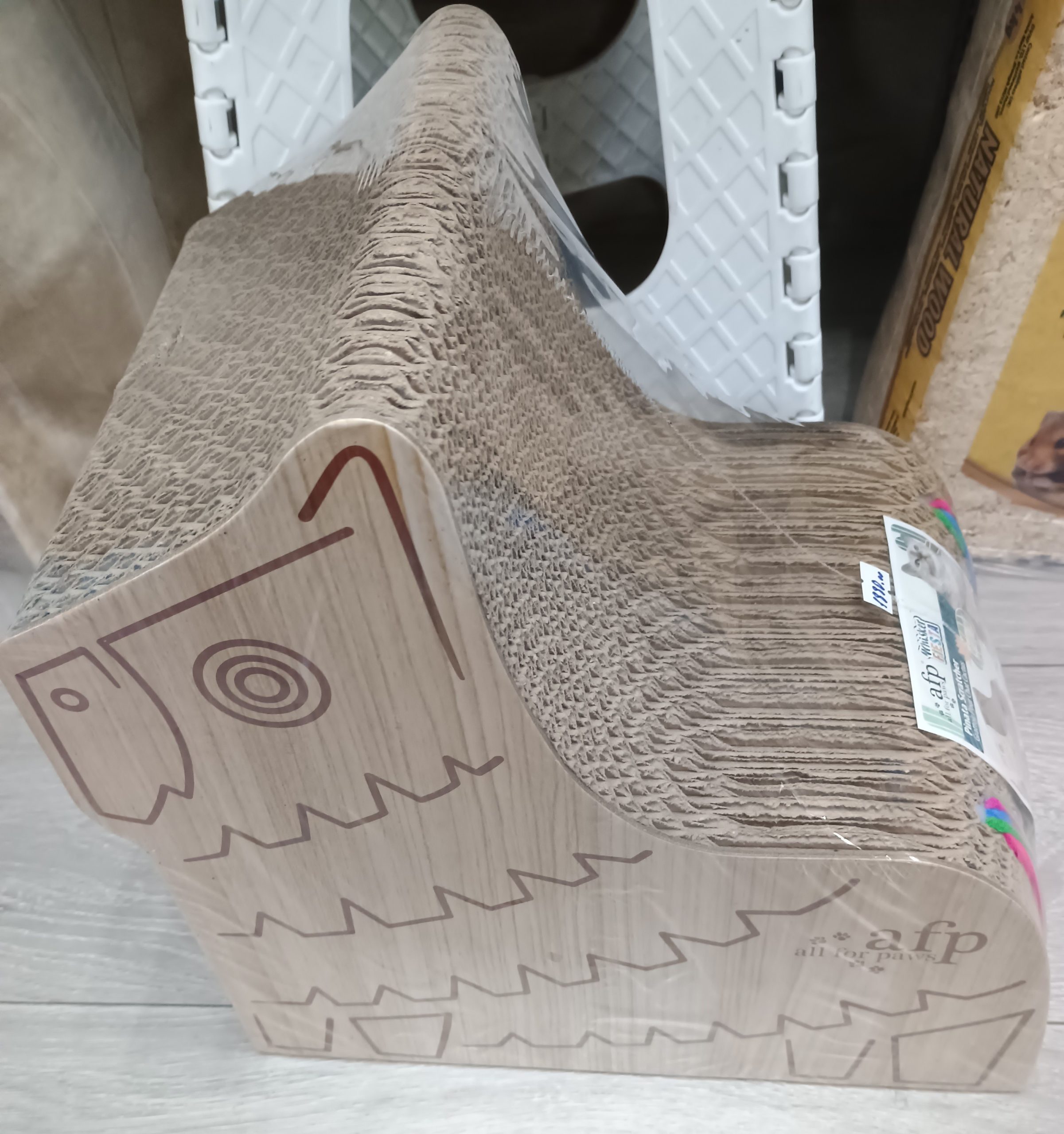 Лепа и стабилна картонска гребалица занимљивог дезена са дрвеним зидовима са стране. Погодна је за маче лил мале мачке