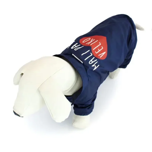 Kombinezon od vodootpornog materiala sa postavom sa zatvorenim nogavicama i stomakom za male pse. Lako se čisti. Ima lep natpis na leđima.