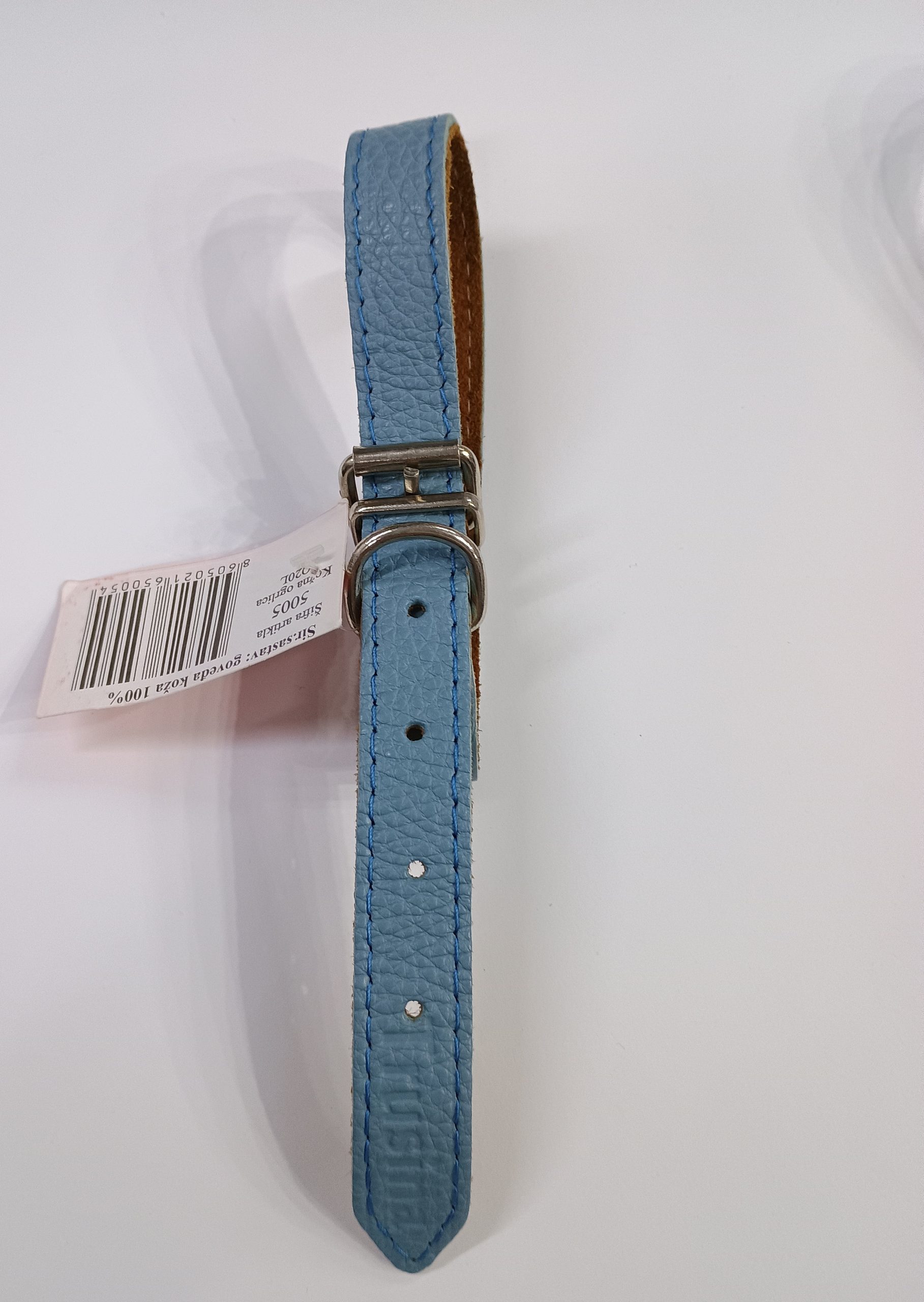 Ogrlica nežno plave boje za male pse izrađena je od vrlo mekane prirodne kože. Ima kvalitetnu kopču.