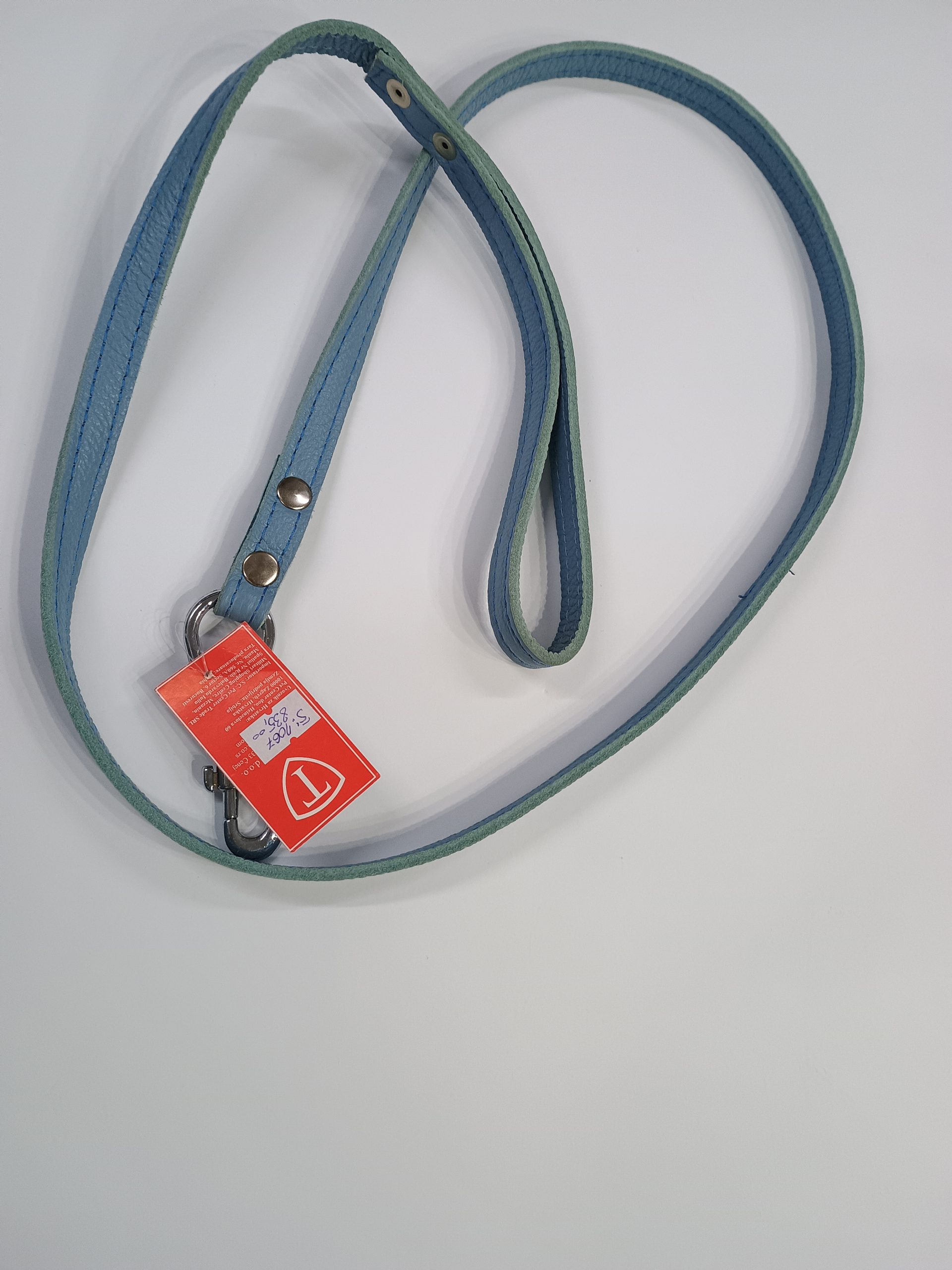 Povodac nežno plave boje za male pse izrađen je od vrlo mekane prirodne kože. Ima veliku kvalitetnu kopču i udobnu dršku.