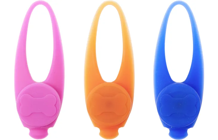 Silikonski vodootporni privezak za pse, sija u mraku. Može se zakačiti za ogrlicu. Radi u 3 režima, od 2 batareje CR2016