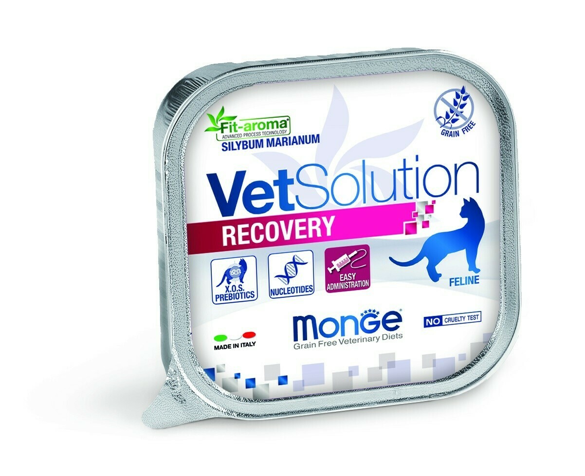 Monge VetSolution Recovery je kompletna dijetalna hrana za kućne ljubimce formulisana za obnavljanje ishrane, obnavljanje. Sadrži nukleotide za podršku imunološkom sistemu, ovo seme za podršku rekonvalescenciji, ksilo-oligosaharide (XOS) za obezbeđivanje crevne flore, a formulu karakteriše velika energetska gustina, visoke koncentracije osnovnih hranljivih materija i lako svarljivi sastojci.